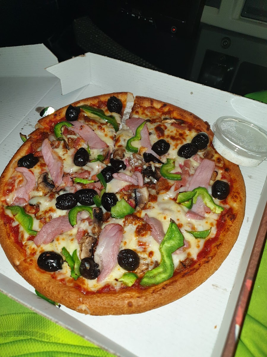 Ordered a 12 inch custom pizza and a regular chicken kebab. Plus a portion of chips. Would recommend this to others. Pizza was nice. Full olives not sliced. Pizza base was like it was cooked in a pan rather than a flat surface making the base go up round the sides which was reminiscent of pizza hut. Not too bready. Not thin either. Kebab was the best I've had in a while. Great charcoal smokey flavour. Go larger if you want more. Chips were obviously from packet. Nothing to shout about there. Maybe a bit dry/too crisp but that us all. Collected and was ready after a 10 min drive.