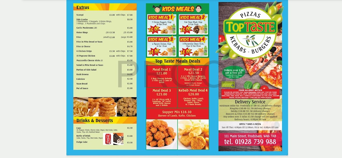 Top Taste offers a straightforward, casual menu focused on hearty, satisfying fast food you can enjoy on the go or as a cozy takeaway meal. The selection combines well-loved kebabs, flame-grilled meats, and customizable pizzas, creating a comforting and familiar dining experience that fits well with busy days and relaxed evenings alike.